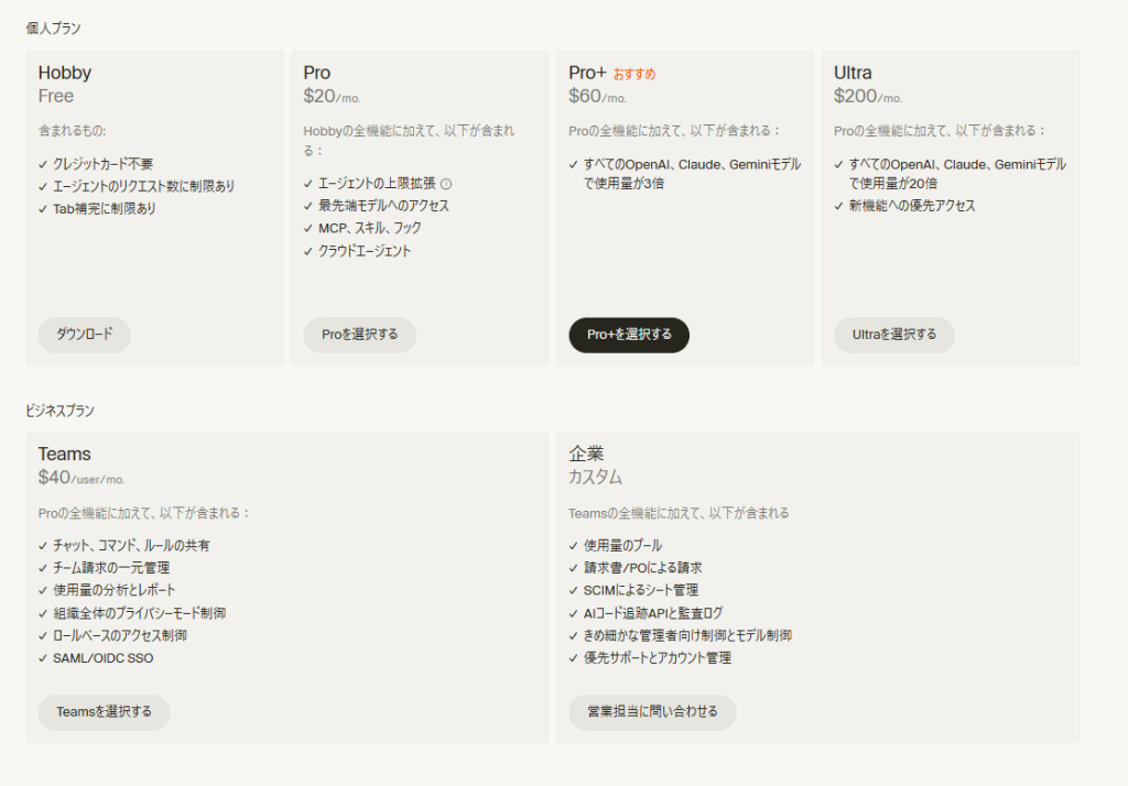 | API提供 | Cursor自体のAPIは未確認。Cursor内で外部APIキー(OpenAI、Anthropicなど)を設定して使用するモデルを切り替える機能あり |