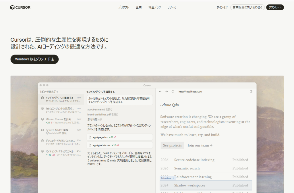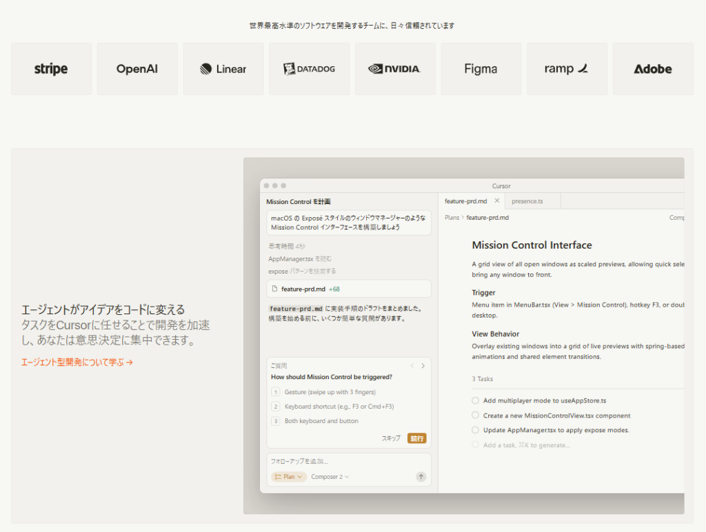Cursorは、「AIがコードエディタの中核にいる」という体験を提供するツールです。