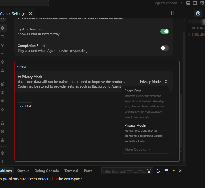 Privacyモードを有効にしていない場合、入力したコードや指示がCursor側に送信されます。